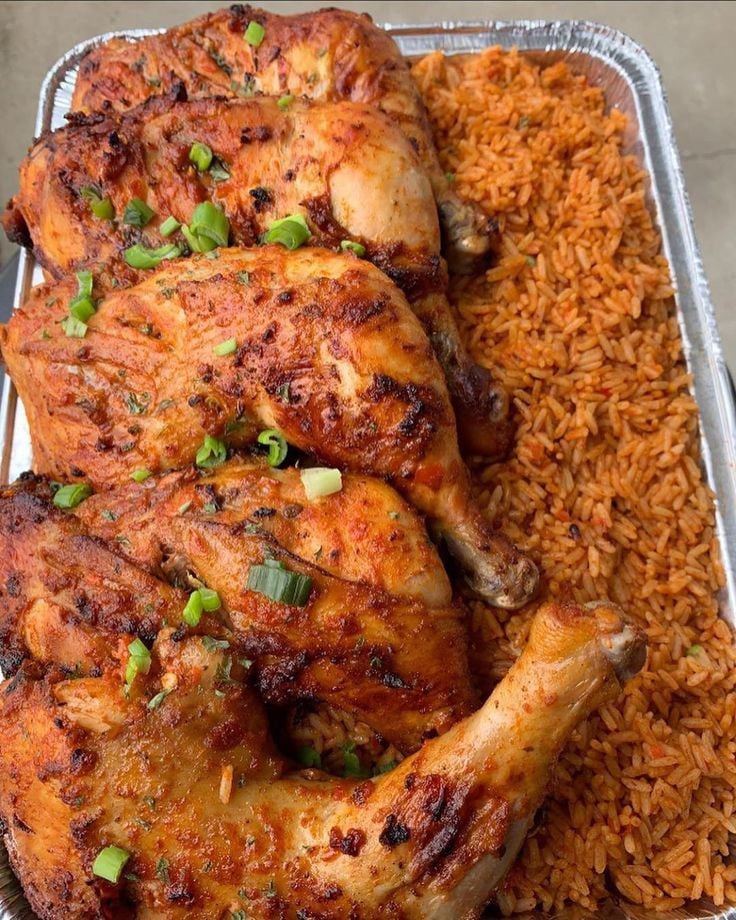 Delicious jollof rice served with variety of meats and vegetables.