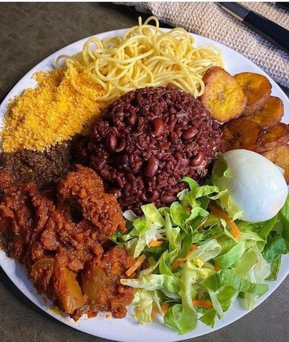 Traditional Ghanaian dish of rice and beans, served with sides.