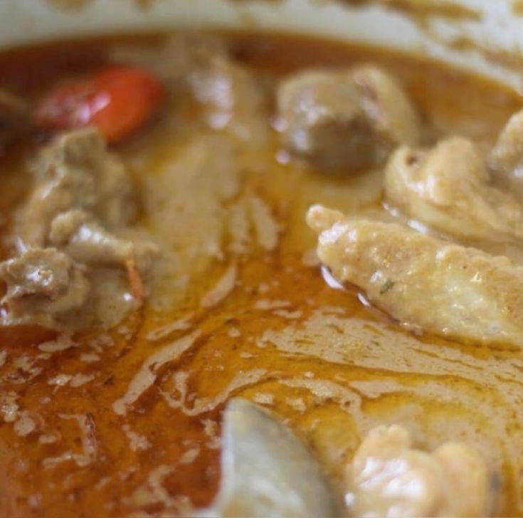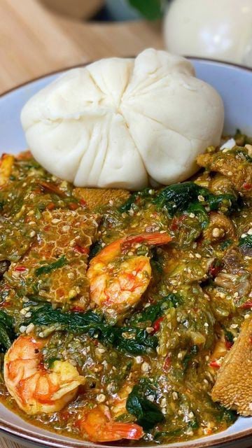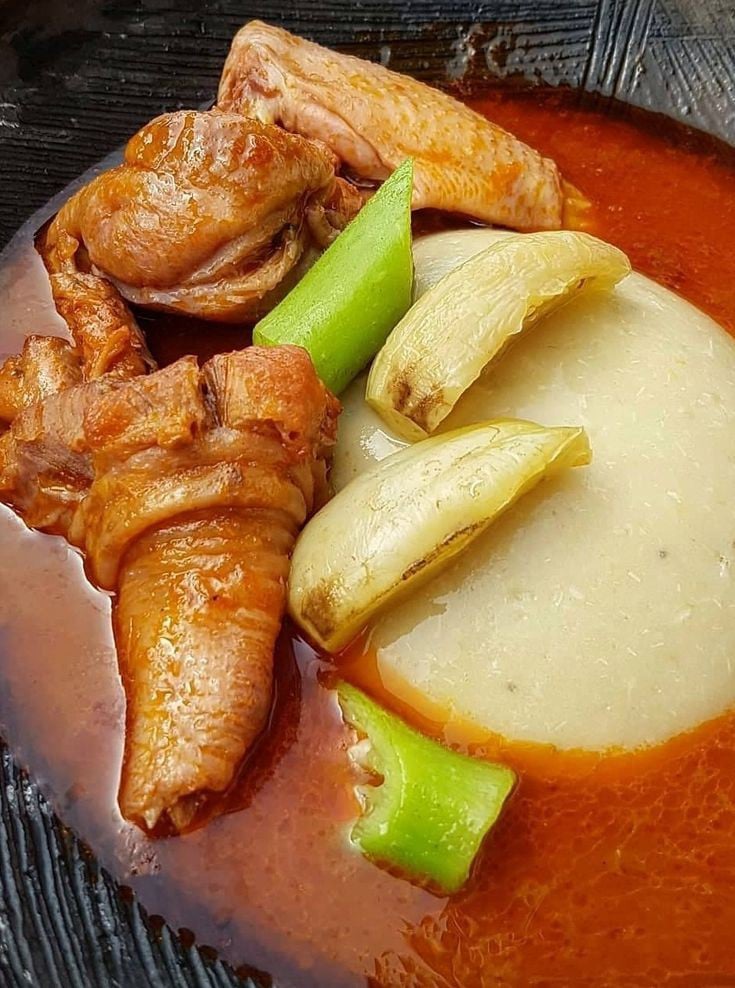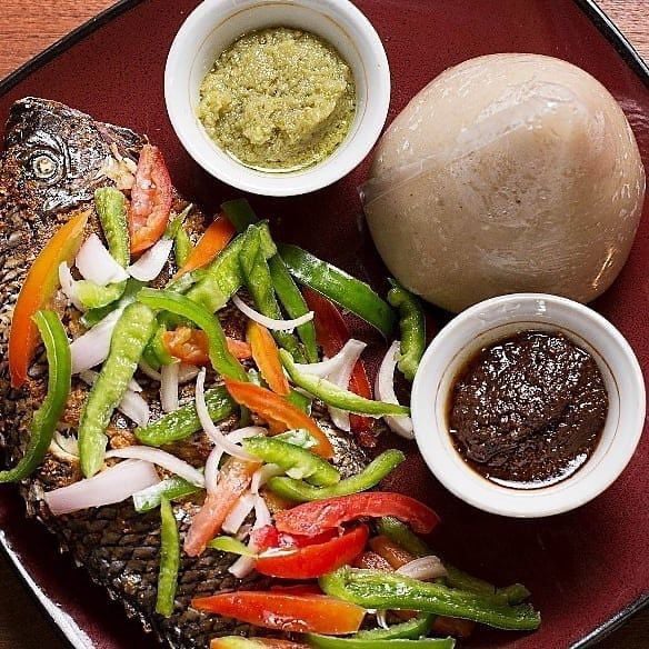 A smooth, stretchy dough made from pounded yam or cassava, served with soup and meat, either cow meat, tilapia or chicken.