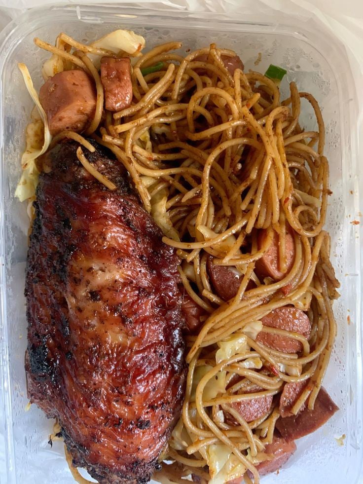 Stir-fried noodles with a variety of meats and vegetables.