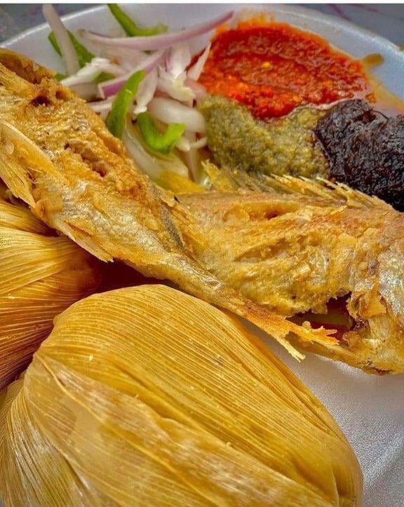 Fermented corn with cassava dough served with tilapia and hot shito.